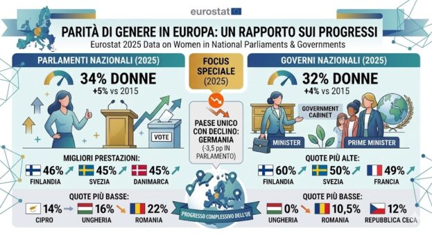 Il volto della politica europea sta cambiando, ma il ritmo è quello di una lenta evoluzione piuttosto che di una rivoluzione. Secondo gli ultimi dati rilasciati da Eurostat, nel 2025 la presenza femminile nei parlamenti nazionali dell’UE ha raggiunto il 34%. Un traguardo che segna un progresso del 5% rispetto al 2015, ma che rivela profonde fratture geografiche e politiche all’interno del blocco.