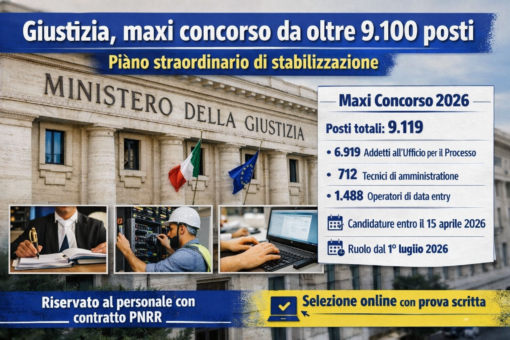 Il Ministero della Giustizia ha lanciato una delle operazioni di reclutamento più significative degli ultimi anni nella pubblica amministrazione italiana, con oltre 9.100 posti a tempo indeterminato messi a concorso tramite tre distinte procedure pubblicate il 16 marzo 2026.
