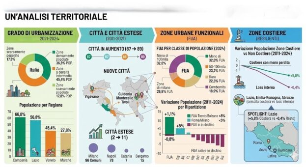 A livello regionale, la Campania (61%) e il Lazio (55%) guidano la classifica della densità abitativa, mentre territori montani come Basilicata e Molise vedono la metà dei residenti vivere in zone scarsamente popolate.