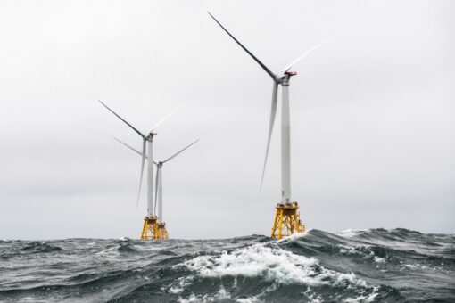 Heavy seas engulf the block island wind farm, the first US offshore wind farm. The five halide 6mw turbines were recently installed by deep water, and are currently under commissioning. Original public domain image from Flickr